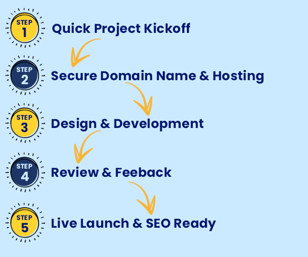 01. Quick Project Kickoff, 02. Secure Domain Name & Hosting, 03. Design & Development, 04. Review & Refinement, 05. Live Launch & SEO Ready.
